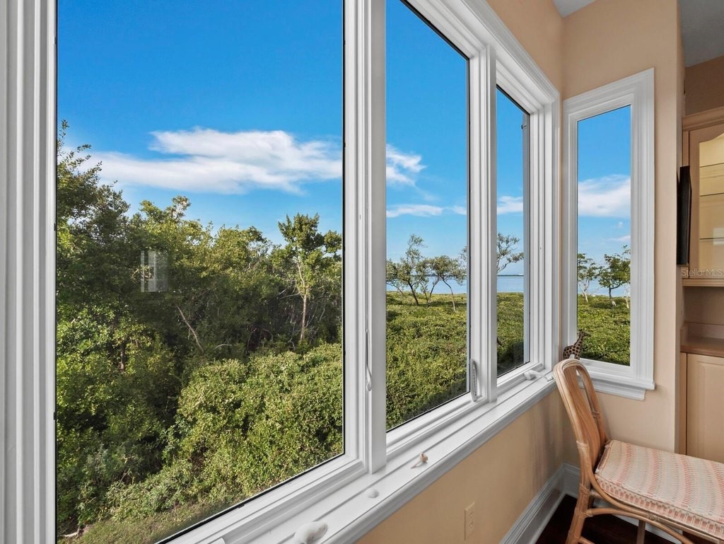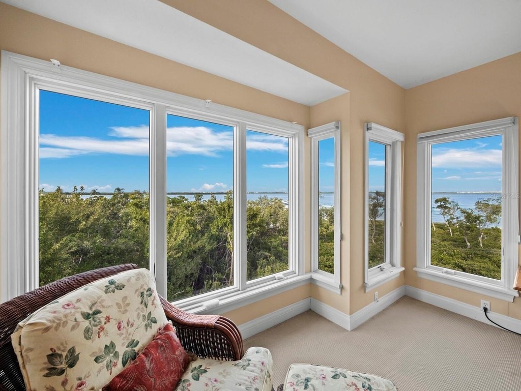 A condo that lives like a single-family home. Introducing a Cedars East double unit offering the space and privacy of a single-family home with the convenience of condo living. Elevated among the treetops on the Bay side of the island, the home enjoys partial Sarasota Bay views and exceptional access to the water perfect for launching a kayak, fishing, enjoying the tide pools. This premier tennis community home comes furnished and features 2 garage spaces, wood floors throughout the first elevated floor, a bright, open great room with a large open kitchen for entertaining, with water views of Sarasota Bay, and inviting fireplace, screened decks for bay breezes, and an office/den. Upstairs is the primary bedroom with multiple walk-in closets, ensuite bathroom and screened porch where you can unwind and catch a glimpse of the sunset glow over the treetops. Two guest bedrooms share a full bathroom. Cedars East is filled with amenities. From the clubhouse with a restaurant and Tiki Bar, pool, pickleball and tennis courts, to walking trails through the mangroves, a kayak launch and a bayside community pier for gathering, fishing and enjoying the sunrise. There's even an onsite tennis pro if you need lessons. Joan Durante Park Community Park and the Gulf beaches are nearby. What are you waiting for? Make this your home today.